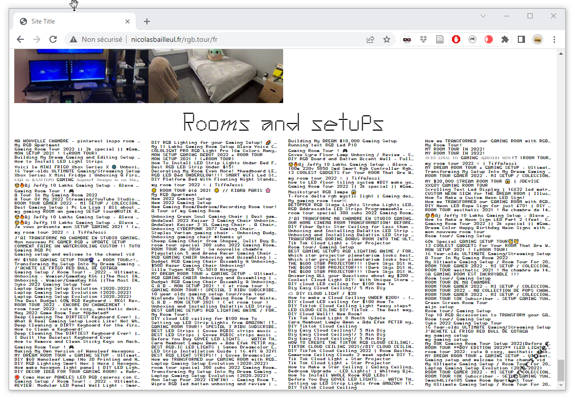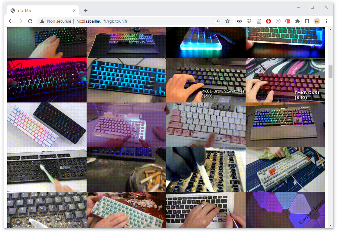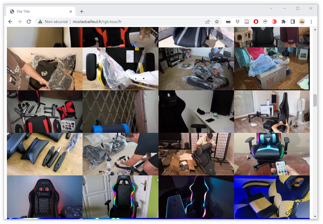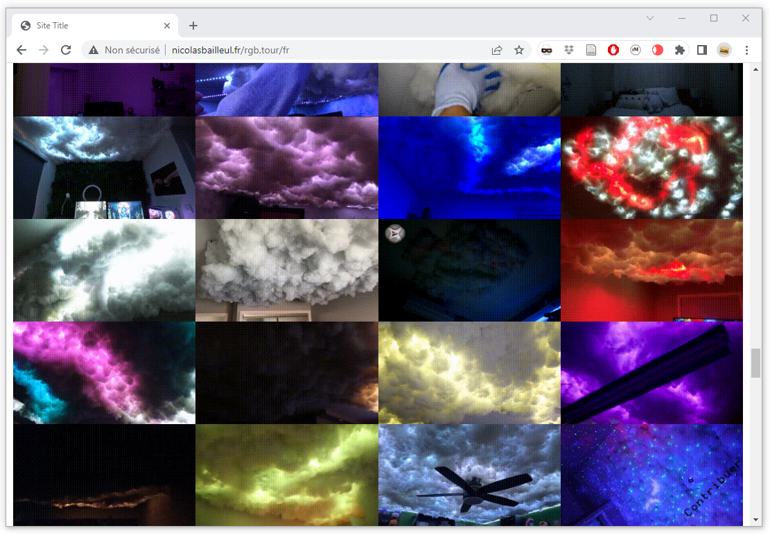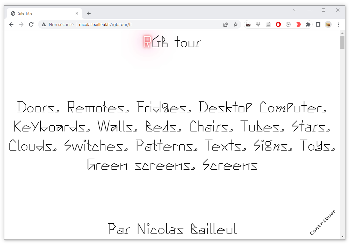 The video installation "RGB Tour" is an evolving HTML page that accumulates an increasing number of video excerpts from room tours (an extremely popular practice that consists of a filmed guided tour of the creator's room), listed and downloaded using a program that transforms specific sequences of YouTube videos into animated GIFs lasting 5 to 10 seconds. Each downloaded excerpt is categorized in the grid of the page based on the objects that appear in the image and the resulting lighting atmospheres.