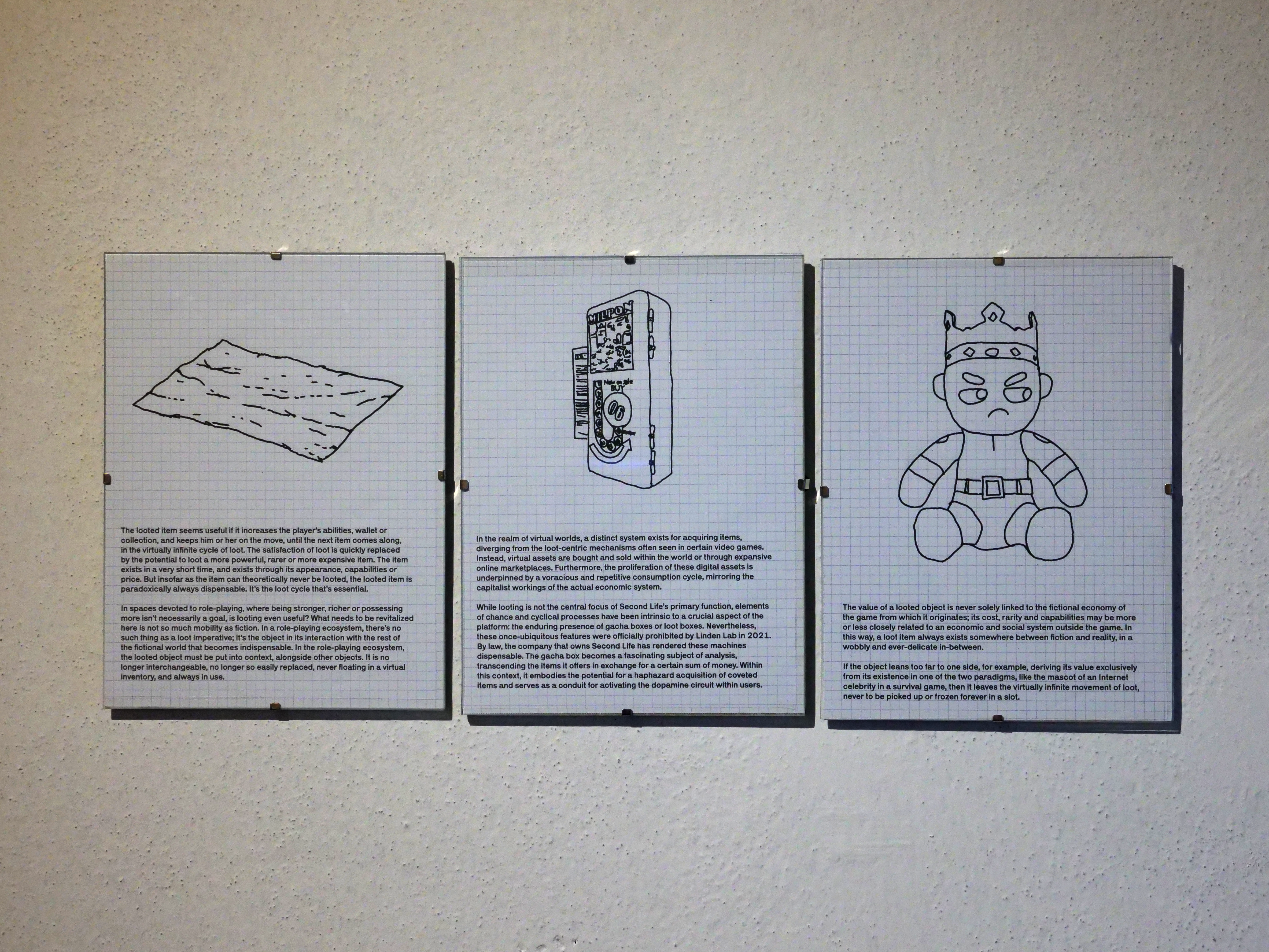 The question of truth in contemporary times leads us to consider issues of power ownership in a globalized, stacked, and suffocating world: who owns the earth, what circulates on it (information as well as goods), to create the big narratives in which we live in? Through practices of gleaning on the Internet as a renewed attention to the small, the leftovers or the details of what lies behind a décor imposed as a truth without alternative, our proposal is articulated as a manner of faire avec (Citton, 2020). Faire avec can be translated to “doing with”. It implies a methodology in action within a system, and this is where the word “loot” appeared in our discussions. From simple screws to legendary weapons, “loots” generally refer to items and rewards players can collect in video games and are often at the root of the value system. In that sense, we wish to question objects or data collection by becoming collectors ourselves. In the gesture of the gleaner or the ragpicker, there is the action of bending down to keep what is left (grains of wheat after harvest, if we focus on Millet's painting, for example), but also of giving another life to discarded or obsolete objects. With five artists and researchers from Paris 8 University, we have imagined the exhibition The Looting Bag Theory of Fiction, a direct reference to Ursula K. Le Guin’s essay The Carrier Bag Theory of Fiction in which she suggests that bags and containers instead of weapons are the first survival objects in human history (Le Guin, 1986). In the hollow of our bags, you will find the looted object we have gathered and want to redeploy outside of their original territories to draw alternative paths within an imposed system of truth.