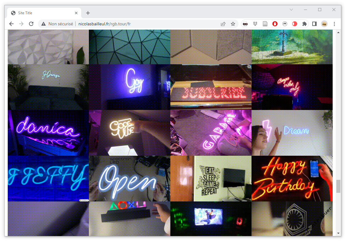 L’installation vidéo «RGB Tour» est une page HTML évolutive dans laquelle s’amoncellent un nombre croissant d’extraits vidéo de room tour (une pratique extrêmement populaire qui consiste en une visite guidée filmée de la chambre du/de la créateur.rice en question), répertoriés et téléchargés à l’aide d’un programme qui transforme des séquences précises de vidéos YouTube en GIF animé d’une durée de 5 à 10 secondes. Chaque extrait téléchargé est classé dans la grille de la page en fonction des objets qui apparaissent à l’image et des ambiances lumineuses qui s’en dégagent.