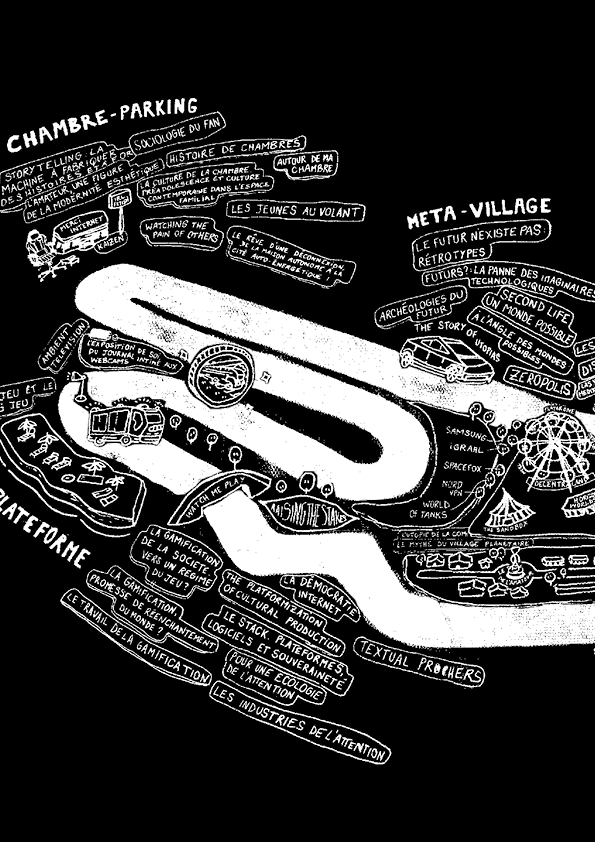 Pourtant, le GP Explorer nous a semblé être l’incarnation exemplaire d’une utopie surannée, du rêve d’un Internet augmenté, alimenté de coques Rhinoshield, de simulateurs de courses, de bracelets avec fragments de météorite intégrés et d'abonnements NordVPN. Cette conférence-performée, réalisée dans le cadre d’un projet collaboratif d’auto-édition intitulé « C’est Internet », vise à réactiver un déplacement depuis nos chambres jusqu’au circuit Bugatti du Mans, sous 35°C.