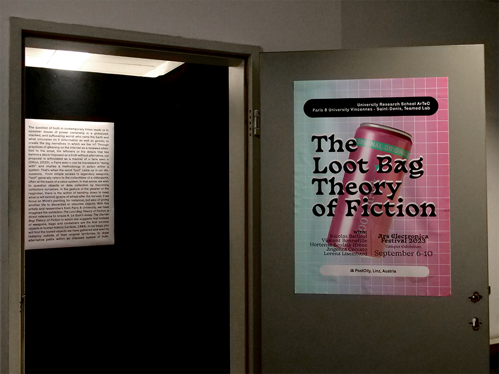 The question of truth in contemporary times leads us to consider issues of power ownership in a globalized, stacked, and suffocating world: who owns the earth, what circulates on it (information as well as goods), to create the big narratives in which we live in? Through practices of gleaning on the Internet as a renewed attention to the small, the leftovers or the details of what lies behind a décor imposed as a truth without alternative, our proposal is articulated as a manner of faire avec (Citton, 2020). Faire avec can be translated to “doing with”. It implies a methodology in action within a system, and this is where the word “loot” appeared in our discussions. From simple screws to legendary weapons, “loots” generally refer to items and rewards players can collect in video games and are often at the root of the value system. In that sense, we wish to question objects or data collection by becoming collectors ourselves. In the gesture of the gleaner or the ragpicker, there is the action of bending down to keep what is left (grains of wheat after harvest, if we focus on Millet's painting, for example), but also of giving another life to discarded or obsolete objects. With five artists and researchers from Paris 8 University, we have imagined the exhibition The Looting Bag Theory of Fiction, a direct reference to Ursula K. Le Guin’s essay The Carrier Bag Theory of Fiction in which she suggests that bags and containers instead of weapons are the first survival objects in human history (Le Guin, 1986). In the hollow of our bags, you will find the looted object we have gathered and want to redeploy outside of their original territories to draw alternative paths within an imposed system of truth.
