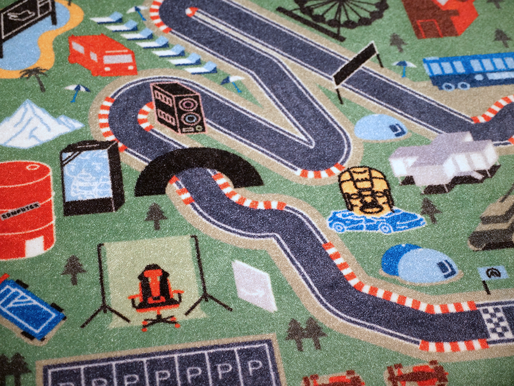 Nicolas Bailleul et Lorena Lisembard proposent une lecture critique de ce phènomène. Leur travail fait coexister, sur un support inspirés des tapis de voitures pour enfant, différents espaces symboliques et des objets de supporters.