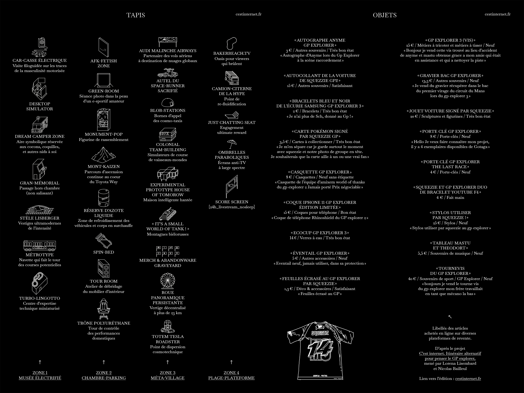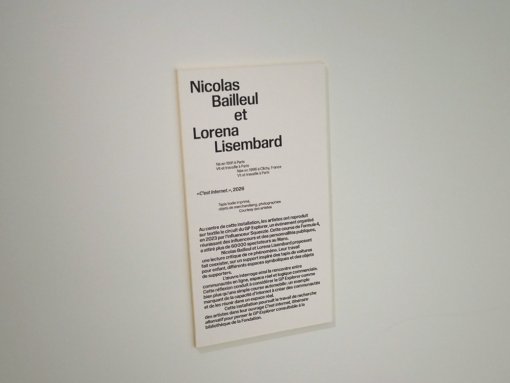 "Au centre de cette installation, les artistes ont reproduit sur textile le circuit du GP Explorer, un événement organisé en 2023 par l'influenceur Squeezie. Cette course de formule 4, réunissant des influenceurs et des personnalités publiques, a attiré plus de 60000 personnes au Mans.